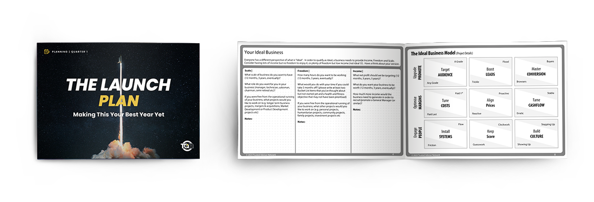 Clients reflect on the year and put together a plan to make the new year their best yet. They will set goals for their business for income, freedom (time away from their business) and the scale they want to achieve. In this planning session there’s a particular focus on the business owner and their personal performance to ensure they have a plan for the role they have in leading others. This process leads into the completion of the 1-Page Plan.
